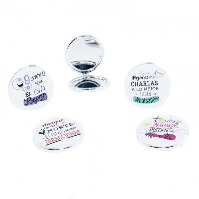 Un espejo redondo cuyo interior lleva dos espejos para que podamos ver cada detalle y en el exterior lleva unas frases y se sirve surtido.