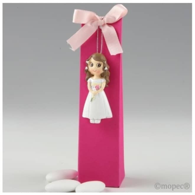 Imán niña Comunión con lirio en caja fucsia, 3 peladillas. PEDIDO MÍNIMO 12 UNIDADES El precio no incluye la grabación de la caja.