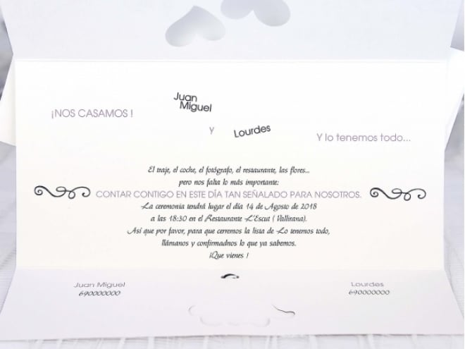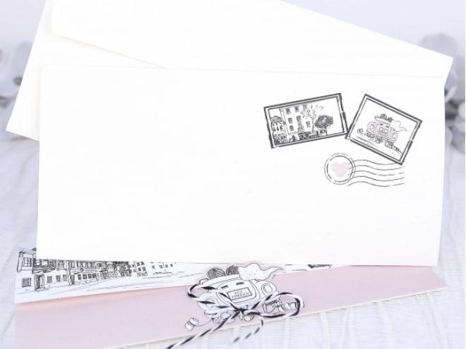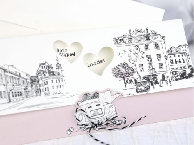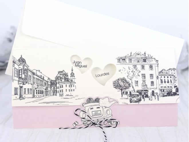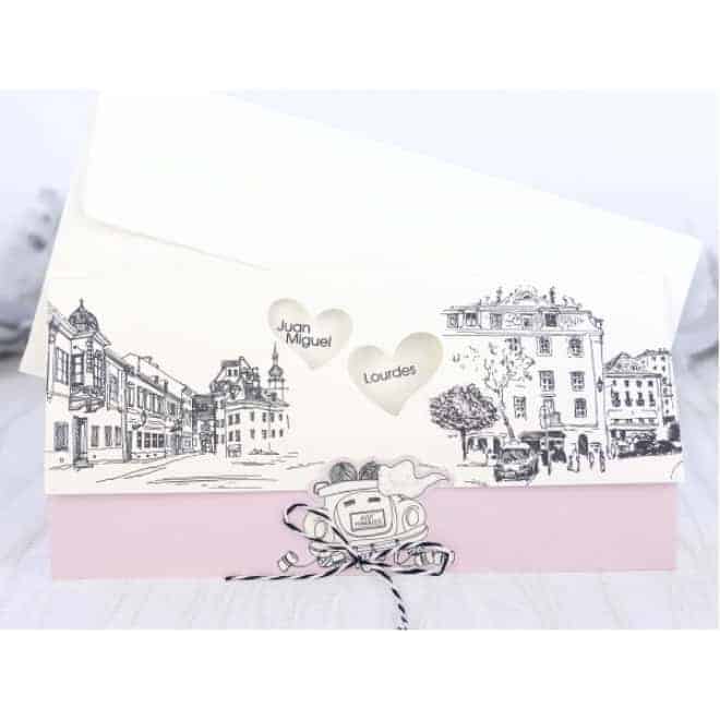 Invitación de boda original, en la portada tenemos las calles de una ciudad dibujadas y unos corazones que muestran el nombre de los novios junto con el texto de la boda. Medidas: 217x105. Solo se puede imprimir en digital. El sobre está incluido en el precio.