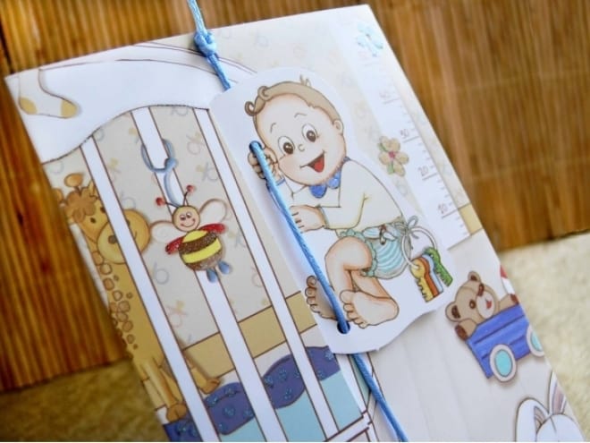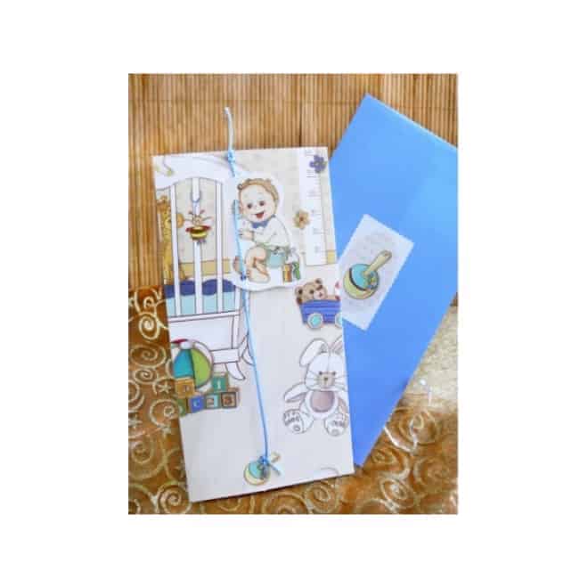 Invitación de bautizo para niño en tono azul. Si tiramos de la cuerda el niño baja de su cuna. Incluye sobre azul.