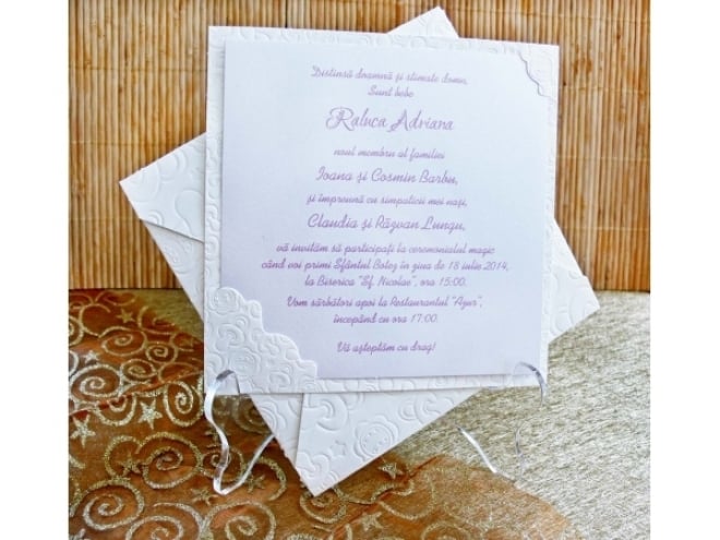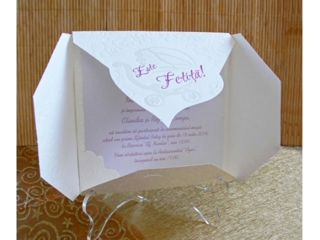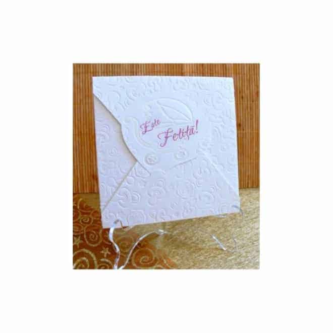 Invitación de bautizo con huellas del chupete dibujadas en la portada.