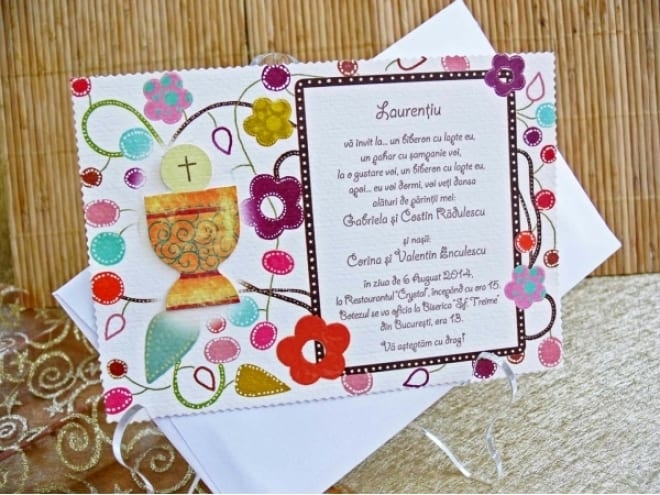 Invitación de bautizo con un cáliz dibujado en el centro y unas flores de colores en los lados. Incluye sobre blanco.