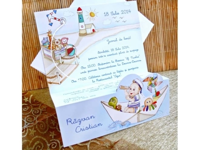 Invitación de bautizo estilo Isla con un barco y una caja de peluches. Muy divertida y colorida.