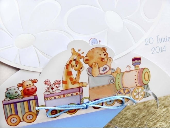 Invitación de bautizo original para niños con flores estampadas y un trenecito lleno de peluches. Incluye sobre azul.