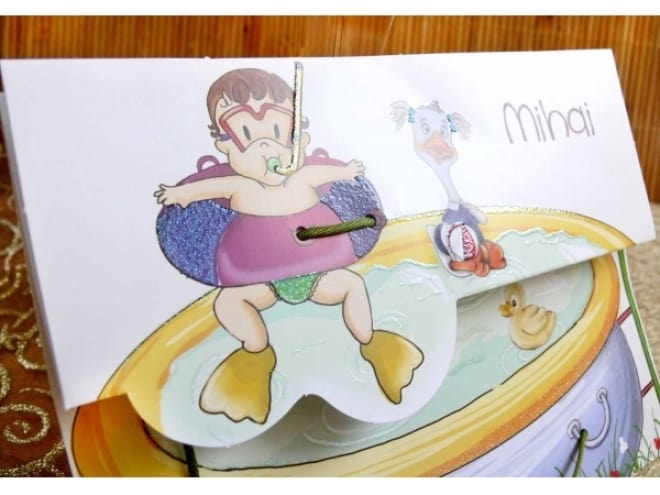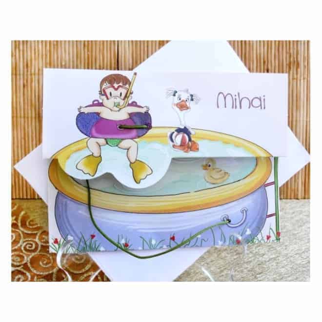 Invitación de bautizo muy original con el dibujo de una piscina y el niño buceando. Incluye sobre.