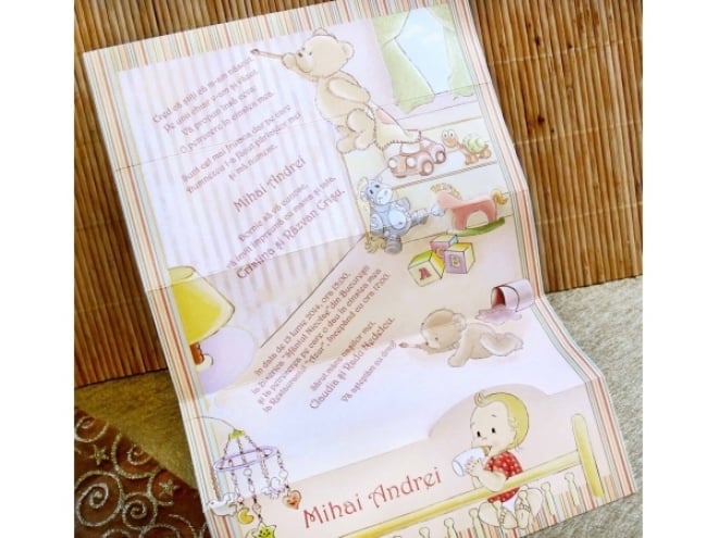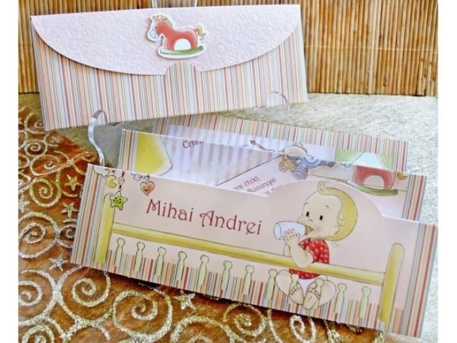 Invitación de bautizo imitando que el bebé está en la cuna tomando su biberón. Incluye sobre a conjunto.