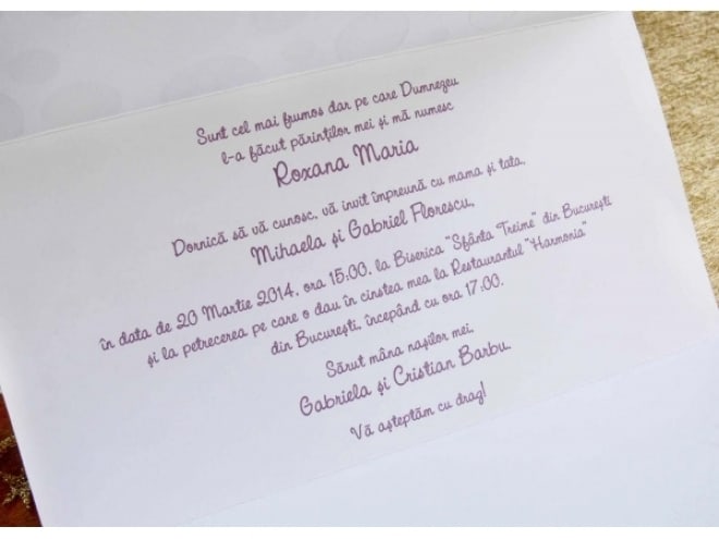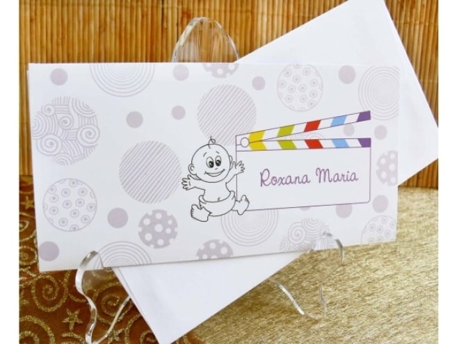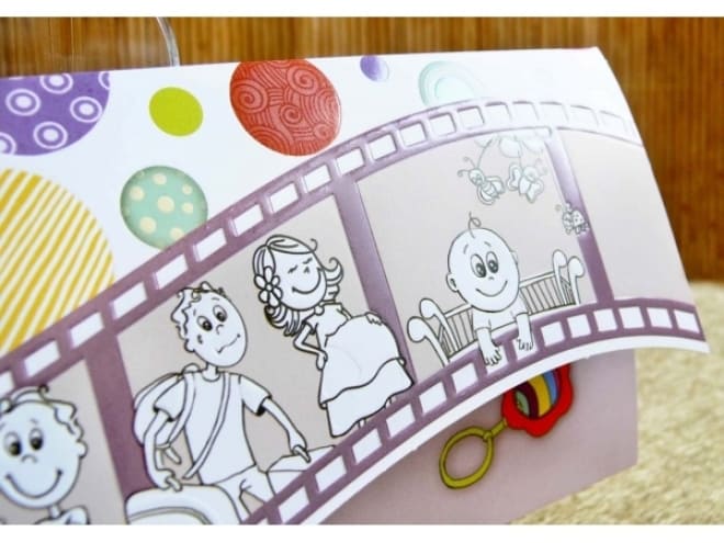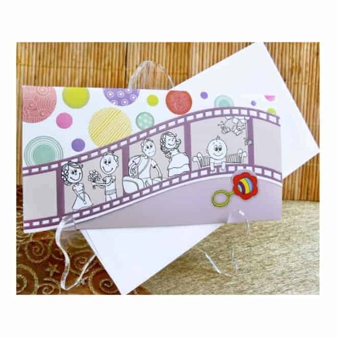Invitación de bautizo estilo película con variedad de colores. Incluye sobre blanco.