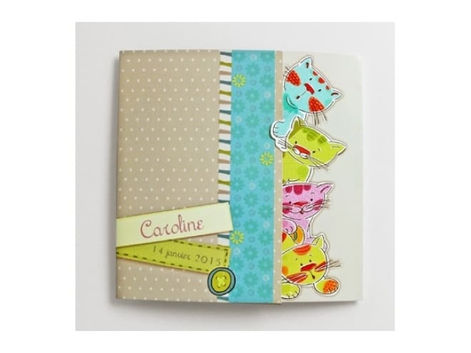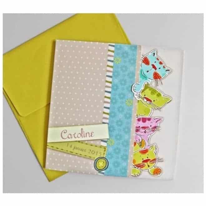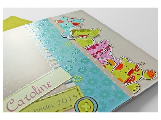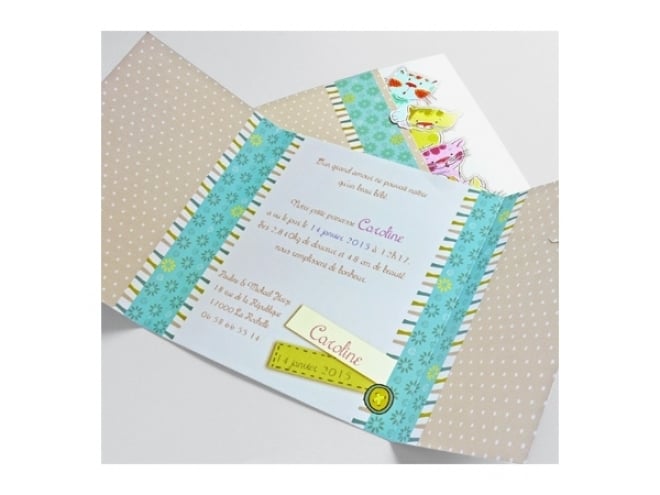 Invitación de bautizo muy original y colorida de unos peluches sorprendidos. Incluye sobre en color lima.