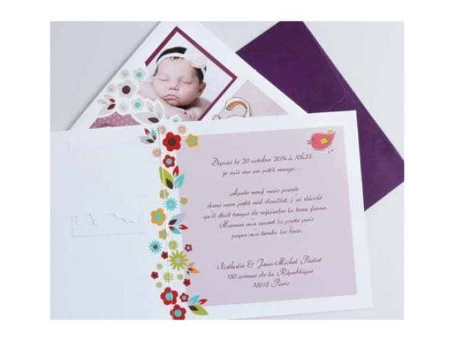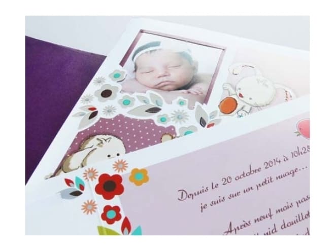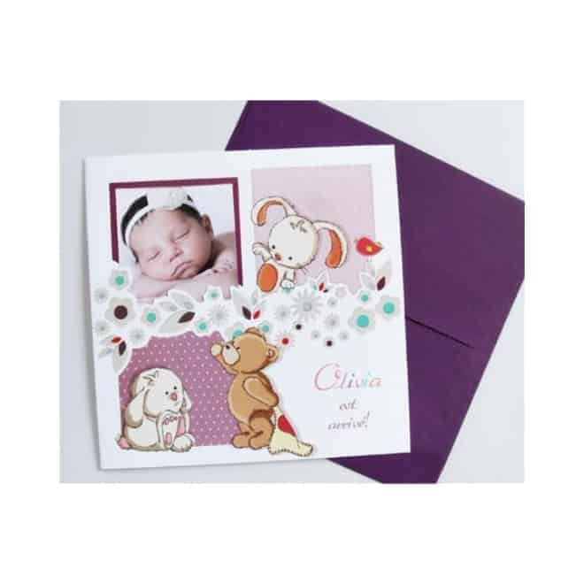 Invitación de bautizo en la que se puede incluir la foto del bebé en la portada junto con los dibujos de los peluches. Incluye sobre morado.
