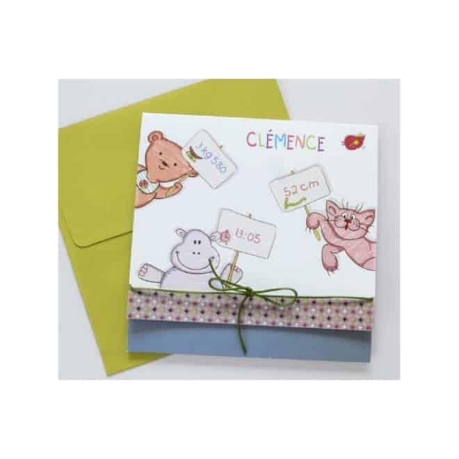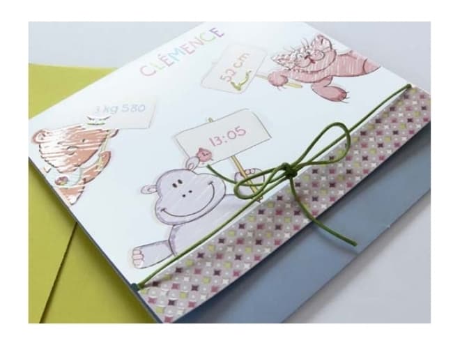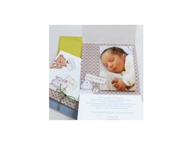 Invitación de bautizo original en la que se puede incluir la foto del bebé en el interior y la fecha de nacimiento, peso y longitud en la portada.