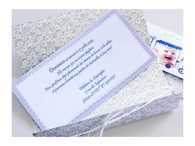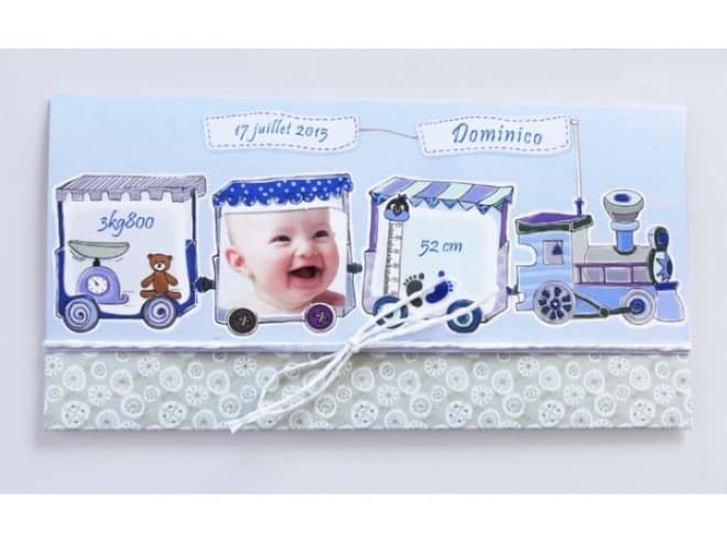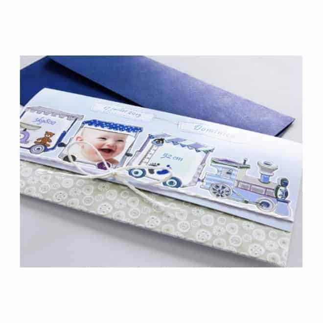 Invitación de bautizo para niño en tonos azul que incluye unos cuadritos para poner la fecha y hora de nacimiento así como el nombre del bebé.