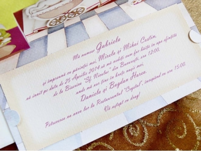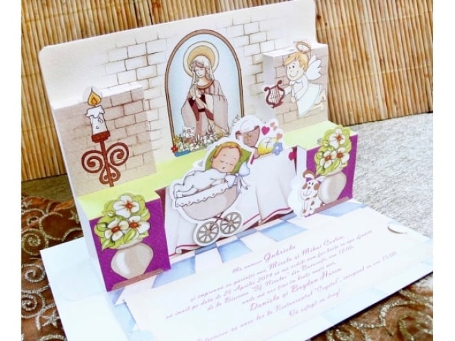 Invitación de bautizo en 3D con el dibujo de la iglesia y el bebé mientras lo bautizan. Incluye sobre.