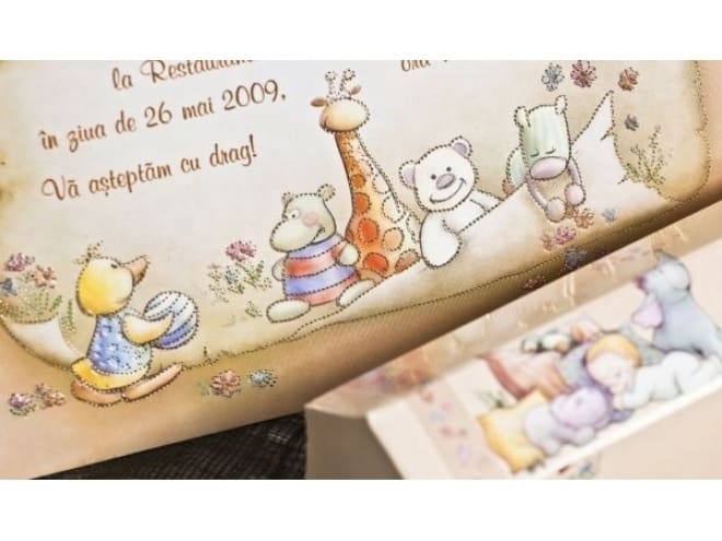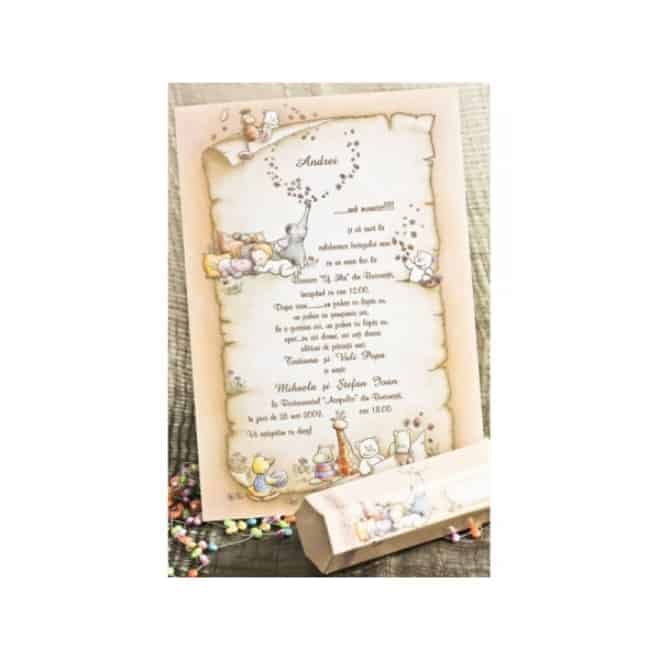 Invitación de bautizo estilo pergamino con dibujos de juguetes.