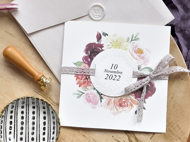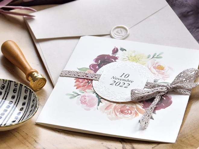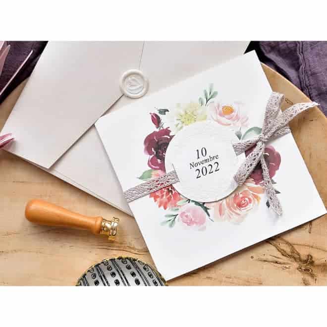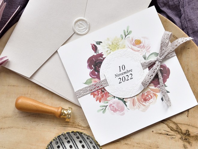 Invitación de boda romántica, la porta está compuesta por unas flores dibujadas con acuarela, en el círculo se muestra el día de la boda. Cuando la abrimos encontramos en la parte derecha el texto con los datos importantes. Todo esto va rodeado de un lazo con un acabado diferente. El sobre es el mismo color que la invitación, para que vayan a juego.