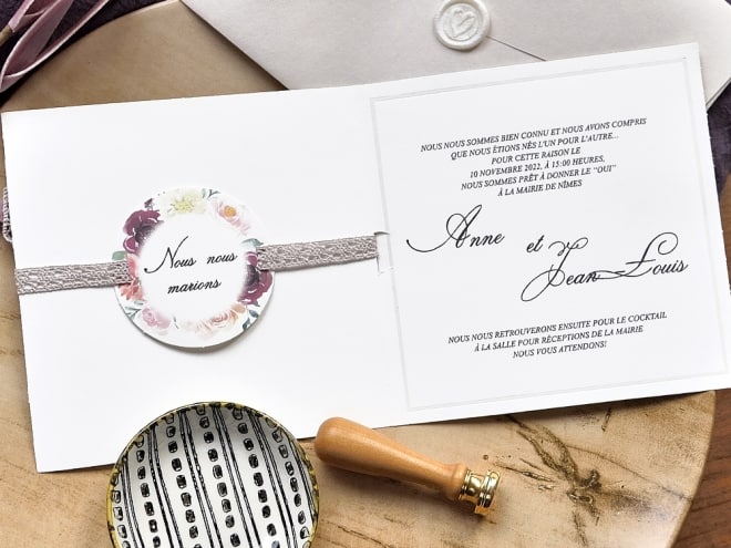 Compuesta por: invitación y lazo. El sobre y el sello del sobre NO va incluidos en el precio, se puede adquirir en la sección tarjetas&menú --> sellos