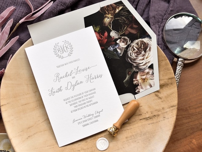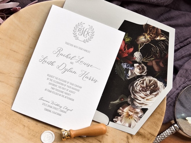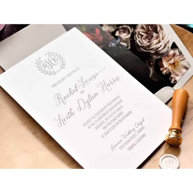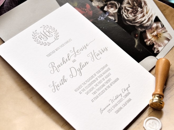Invitación de boda online con acabados impecables para novios exigentes que buscan la pureza en los detalles. Esta invitación está fabricada en papel de alta calidad con fibra de algodón de 600g aproximadamente. Esta invitación sólo se puede imprimir con impresión Letterpress. Vuestros nombres se imprimirán con la técnica de impresión al calor. Los sobres están hecho a mano y fabricados con fibra de algodón. Tenéis la opción de incluir los sellos para los sobres y también los forros del mismo.