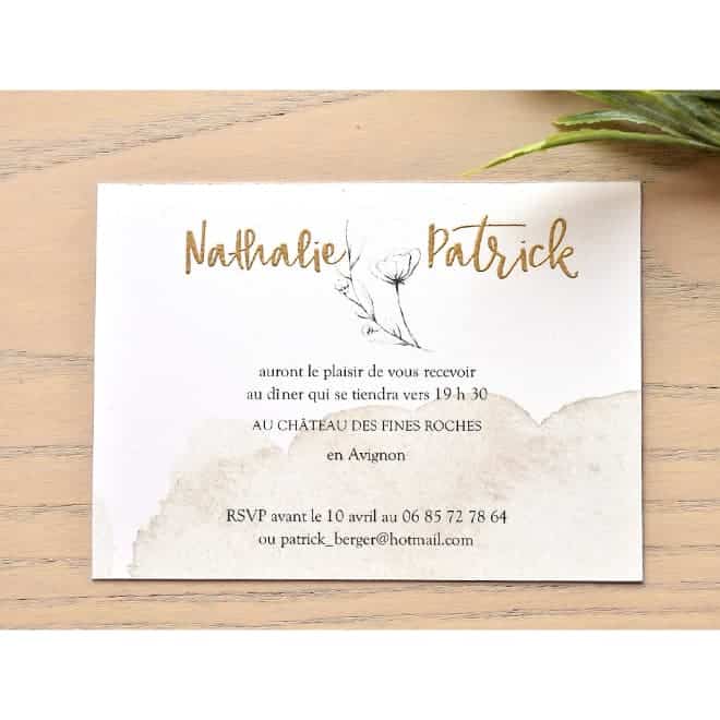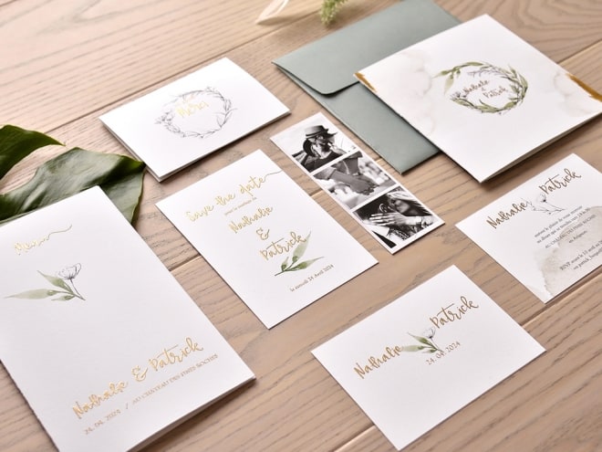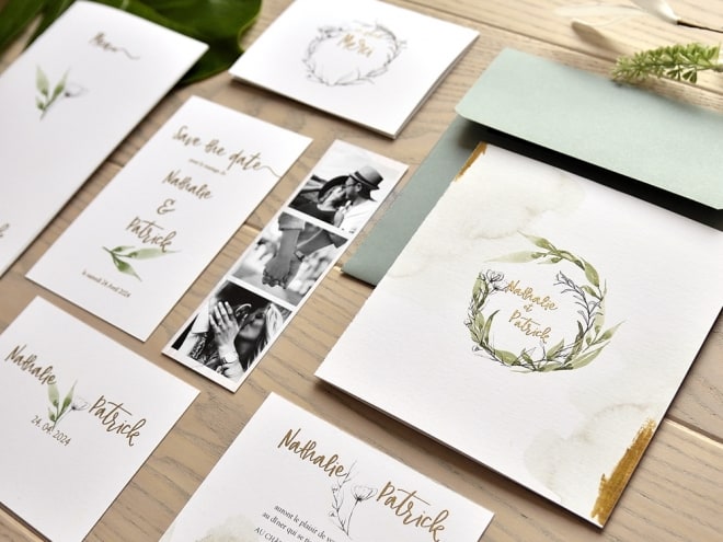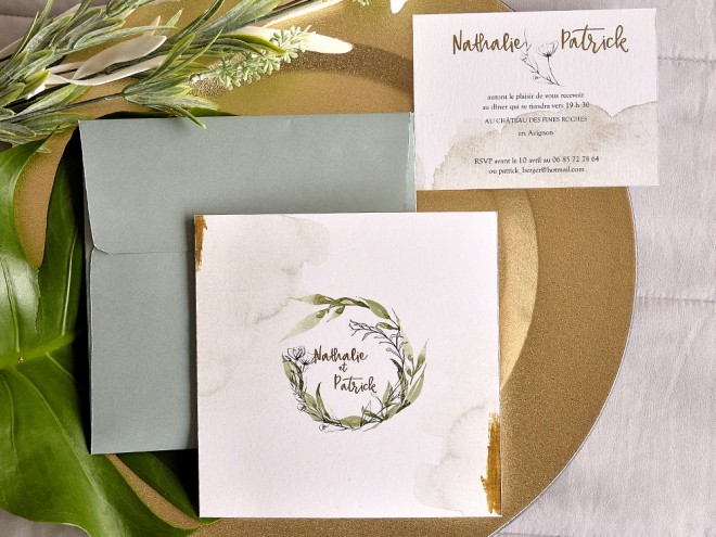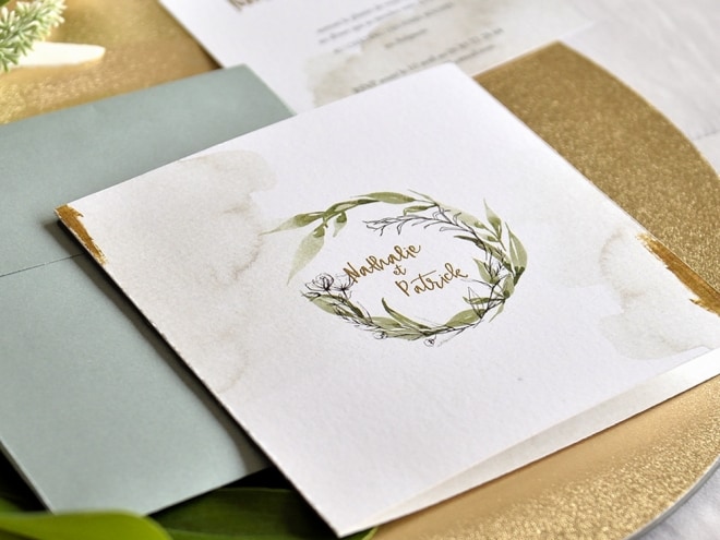 Invitación de boda vintage y muy original. Para las bodas más dulces y románticas, que tengan tonos palo y que quieran destacar en sus invitaciones. Esta invitación tiene en la portada unas ramas de olivo y dentro va grabado el nombre de la pareja. El interior va a juego y muestra el texto del enlace. Solo se puede imprimir con letterpress. Los sobres no están incluidos en el precio. Tiene tarjeta de confirmación a juego y menú, estos tienen un coste a parte.