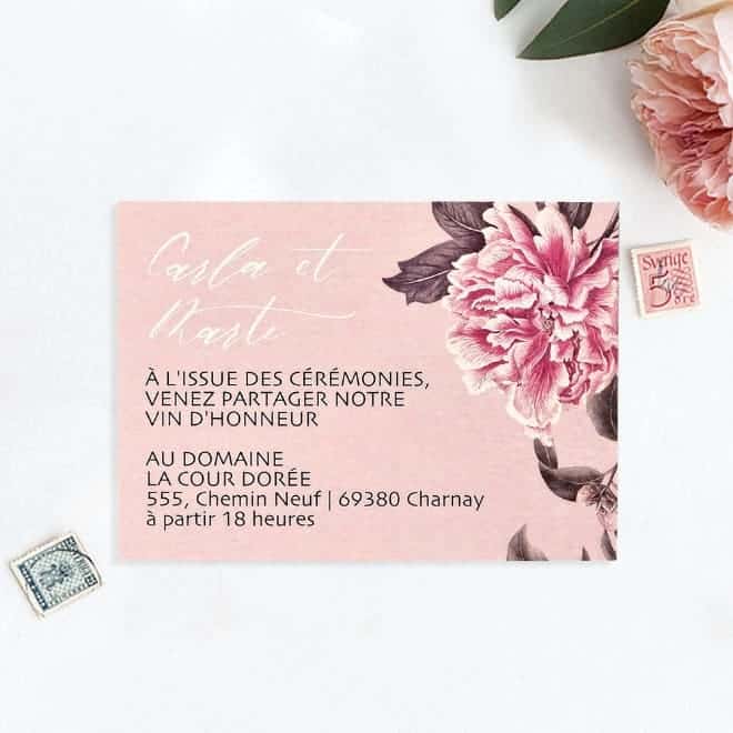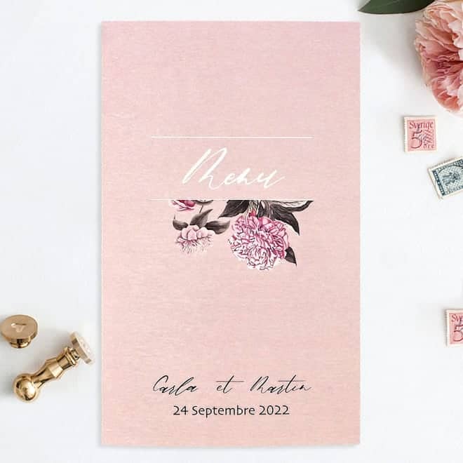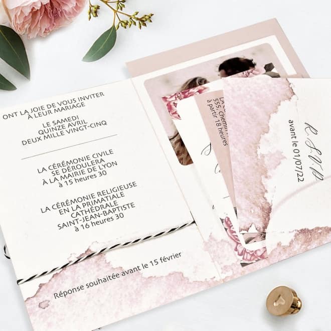La portada, con tonos rosa suaves, tiene flores alrededor de la invitación. En la parte inferior una etiqueta con la fecha de la boda se sujeta con una cuerda con colores blanco y negro.