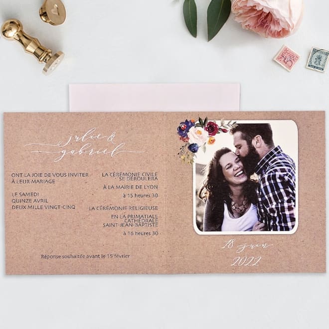La parte interior tiene dos partes, la parte izquierda en la cual está impreso el texto de la boda y la parte derecha, en la que tenemos la foto y la fecha del enlace, todo adornado con flores a juego con el exterior.