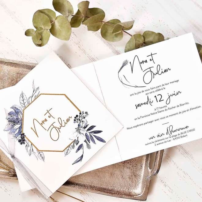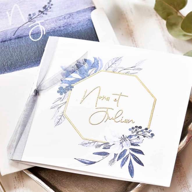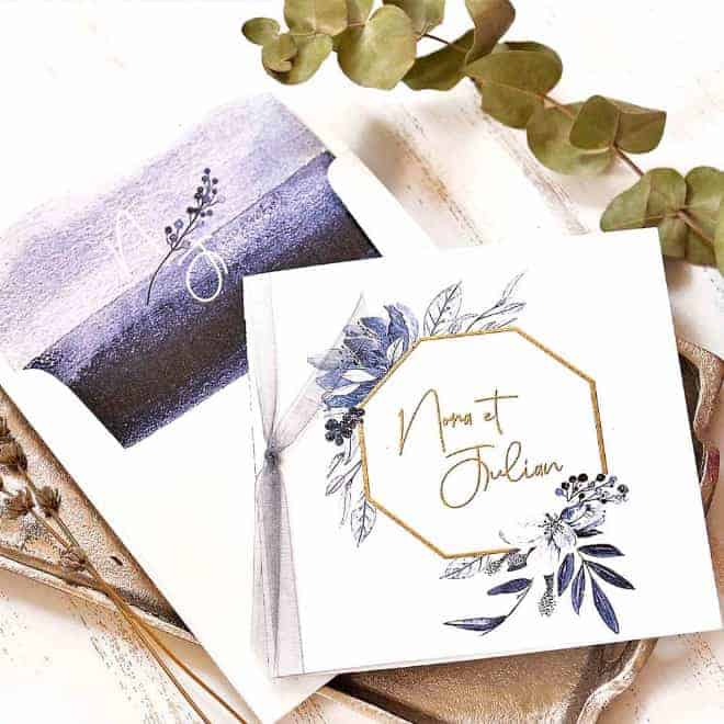 La parte exterior está decorada con unos adornos florales en color malva y azul. El nombre de los novios va impreso en una figura geométrica rodeada de estas flores.