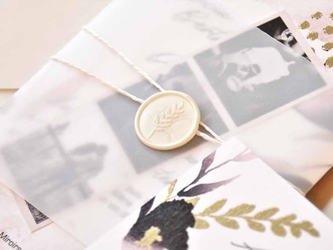 Sobre la tarjeta principal, en la que va impresa el texto y decorada con flores, ponemos papel vegetal para darle elegancia. Sobre esta una cuerda color vainilla y su sello a juego.