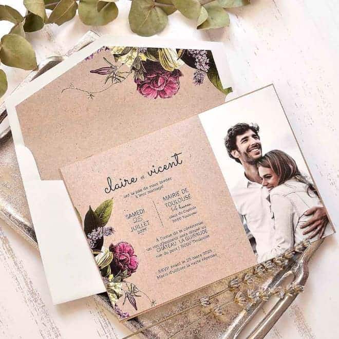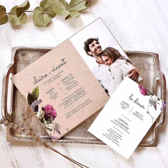 Si buscáis una invitación con tonos tierra, rosados y violetas, esta es la vuestra. La foto está incluida en el precio, podéis enviarnos la que más os guste para que la invitación quede fantástica.