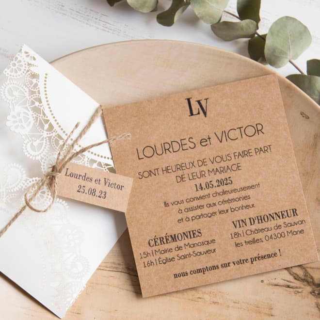 El texto de vuestro enlace, se imprime en la parte interior de la invitación. En la parte exterior de la misma, una pequeña etiqueta anunciará la fecha de la boda, rodeando la invitación con una cuerda del mismo estilo.