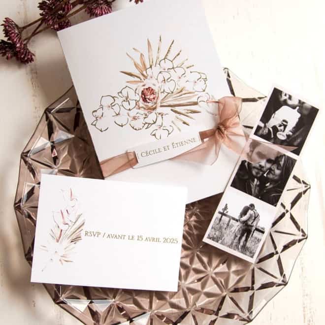 El texto de vuestra boda se imprimirá en el interior de la misma en la que también podéis incluir vuestras fotos al estilo fotomatón.