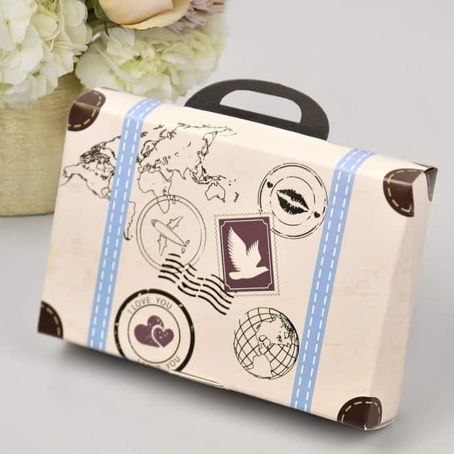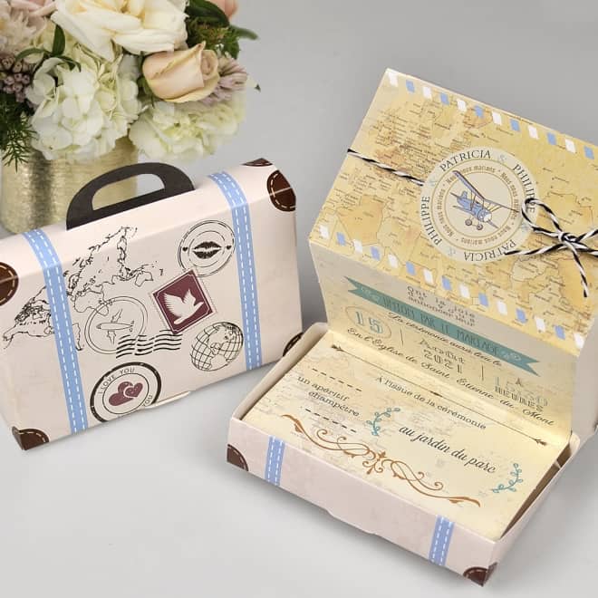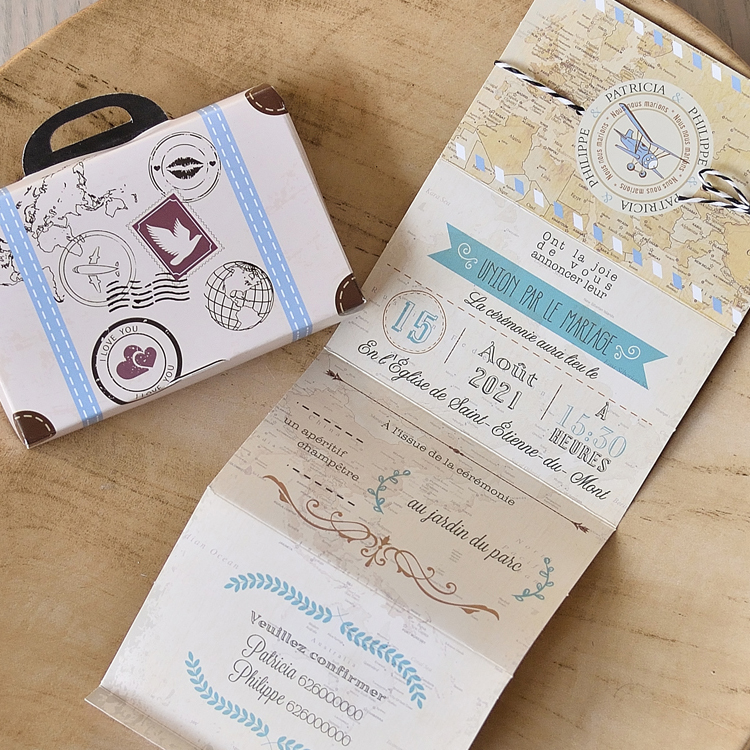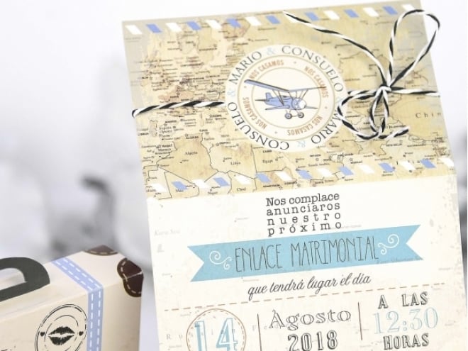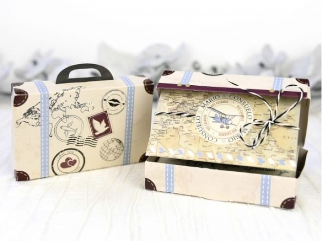 Invitación maleta muy original, en el interior incluye el texto que va impreso sobre un mapa, doblado y se estira hacia arriba para poder mostrar el texto. Incluye cuerda, asa, maleta y tarjeta.