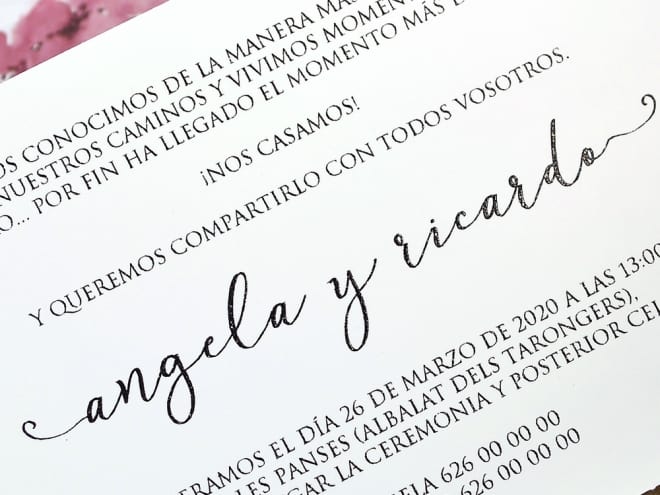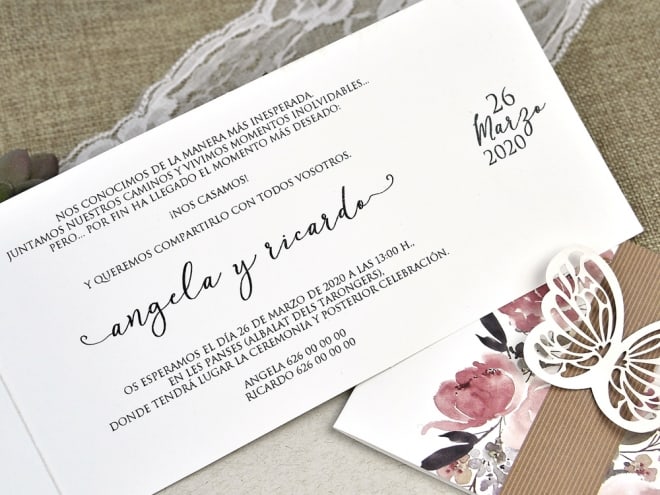 ATENCIÓN: EL FORRO DEL SOBRE NO VA INCLUIDO EN EL PRECIO, CUESTA 0'34 EUROS LA UNIDAD + IMPRESIÓN DEL NOMBRE DE LOS NOVIOS, 12 EUROS EN DIGITAL PARA TODOS LOS FORROS O 24 EUROS EN RELIEVE PARA IMPRIMIR TODOS LOS FORROS.