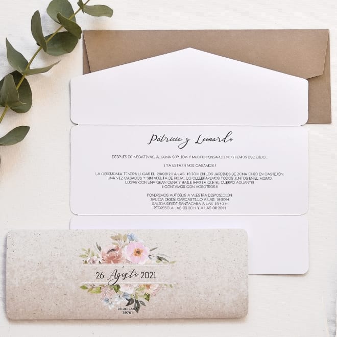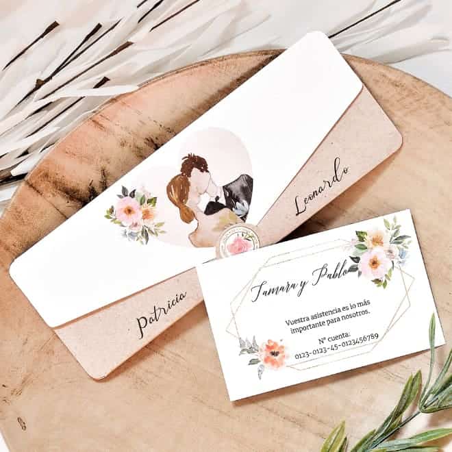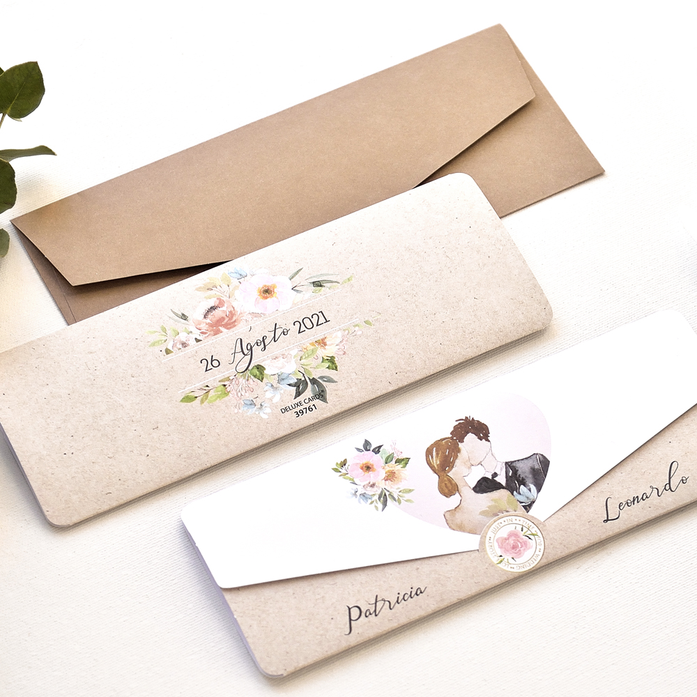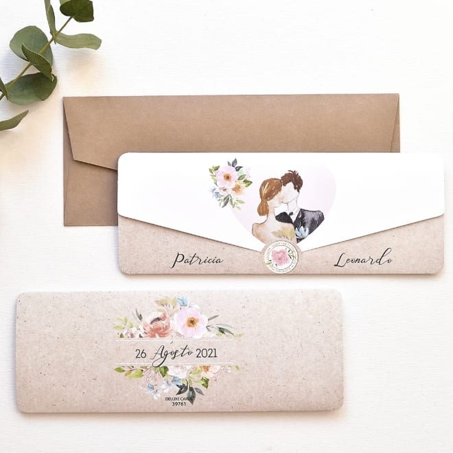 Invitación de boda vintage. Con forma rectangular. En el centro de la portada tenemos a dos novios dentro de un corazón decorado con flores. La invitación se cierra con una pestaña que hay en la parte inferior. Esta parte tiene un color arena, igual que la parte trasera, en la que va grabada la fecha del enlace entre un diseño de flores. Tiene tarjeta de confirmación a juego (no incluída en el precio de la invitación). Tamaño del sobre "Q" (no incluído en el precio de la invitación y disponible en varios colores: Greenery, Dusty Blush, Kraft y Mint) Mirar la pestaña "Tarjetas & Menú y clicar la opción de sobres para ver la disponibilidad de tamaños y colores a elegir.