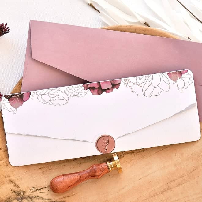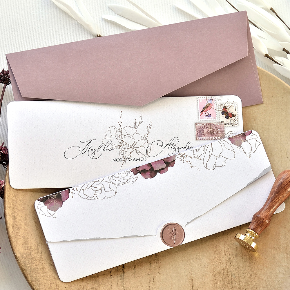 Invitación de boda original. El sobre no va incluido en el precio. Se puede elegir otro color de sobre, disponible en: blanco, dark blush, kraft, dusty rose y mint, tiene que ser formato Q, lo podéis adquirir en la pestaña tarjetas&menú - sobres. Si buscáis una invitación sencilla y natural, con toques florales, esta es vuestra invitación. Ideal para parejas que busquen tarjetas con detalles finos y colores delicados. En la parte trasera de la invitación están grabados los nombres de los novios. Unos sellos de mariposa, cisne y pájaro decoran el lateral de la invitación. El sello marrón va impreso en la invitación y simula que cierra la invitación, para darle el toque especial (no incluido en el precio, se puede adquirir en la pestaña tarjetas&menú - sellos sobres). Tiene tarjeta de confirmación a juego (no incluída en el precio).