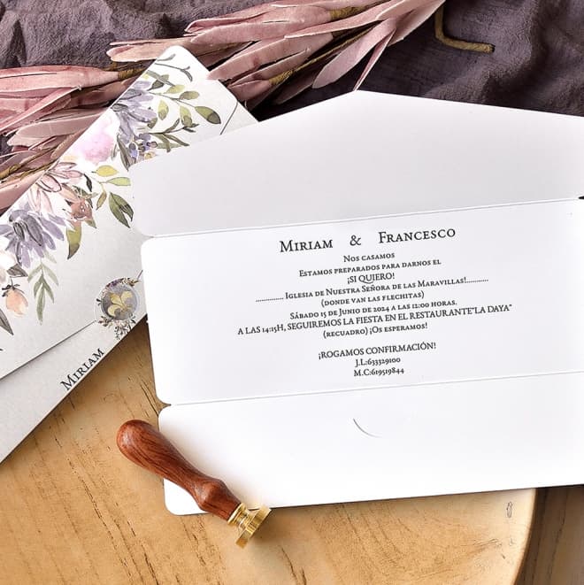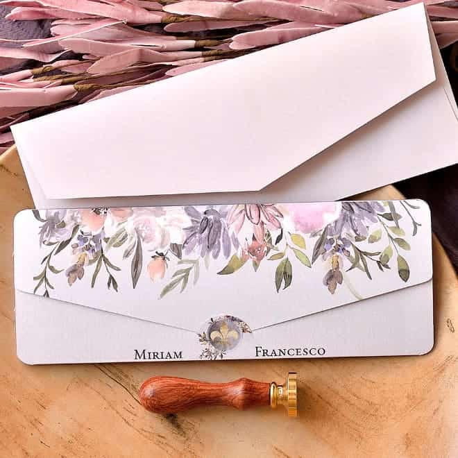 Invitación de boda vintage para novios de gran linaje, ya que como parte principal de la invitación está estampada la flor de lis rodeada de adornos florales. Al abrir la invitación, personalizaremos el texto de vuestra boda en el centro de la misma. Tiene tarjeta de confirmación a juego (no incluída en el precio de la invitación). Tamaño del sobre "Q" (no incluído en el precio de la invitación y disponible en varios colores: Blanco, Dark Blush, Kraft, Dusty Rose y Mint) Mirar la pestaña "Tarjetas & Menú y clicar la opción de sobres para ver la disponibilidad de tamaños y colores a elegir. Disponible sello blanco para cerrar el sobre con dibujo de un corazón en el centro (no incluido en el precio de la invitación). Mirar la pestaña de "Tarjetas & Menú" y clicar la opción de sellos sobres.