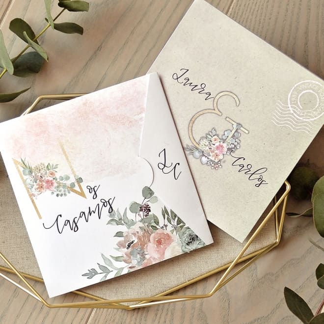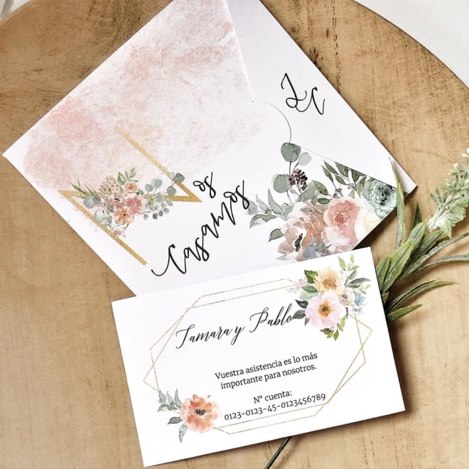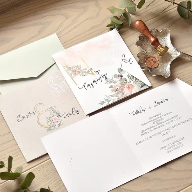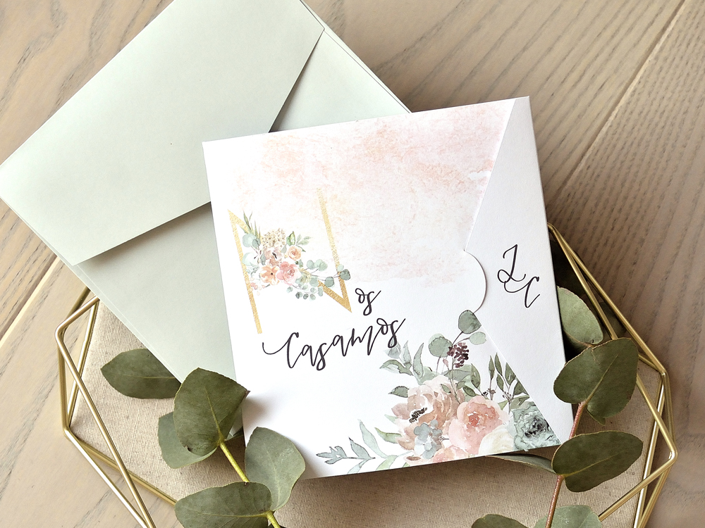 INVITACIóN DE BODA con acabados en color dorado para darle un toque de sofisticación. Si habéis pensado en una invitación distinta y original, esta es la vuestra!. Con estampados florales y cálidos, en la parte de la solapa se imprimirán vuestras inciales, en el interior el texto de vuestra boda y en la parte de detrás, vuestros nombres. Tiene tarjeta de confirmación a juego (no incluída en el precio de la invitación). Tamaño del sobre "B" (no incluído en el precio de la invitación y disponible en varios colores: Greenery, Dusty Blush, Kraft y Mint) Mirar la pestaña "Tarjetas & Menú y clicar la opción de sobres para ver la disponibilidad de tamaños y colores a elegir.
