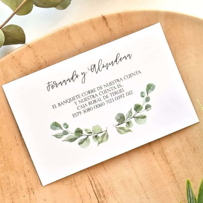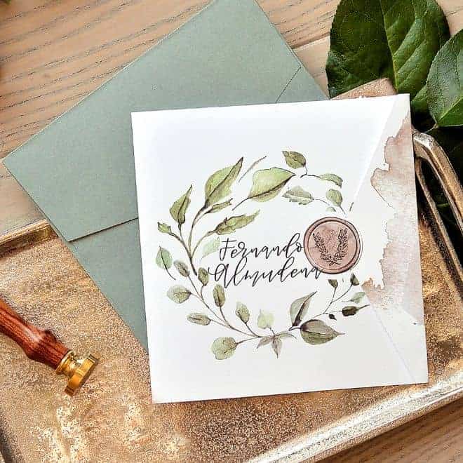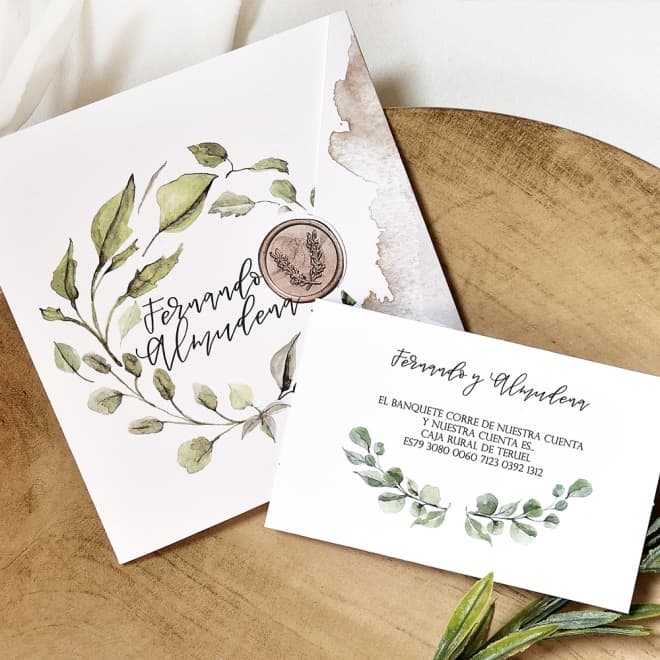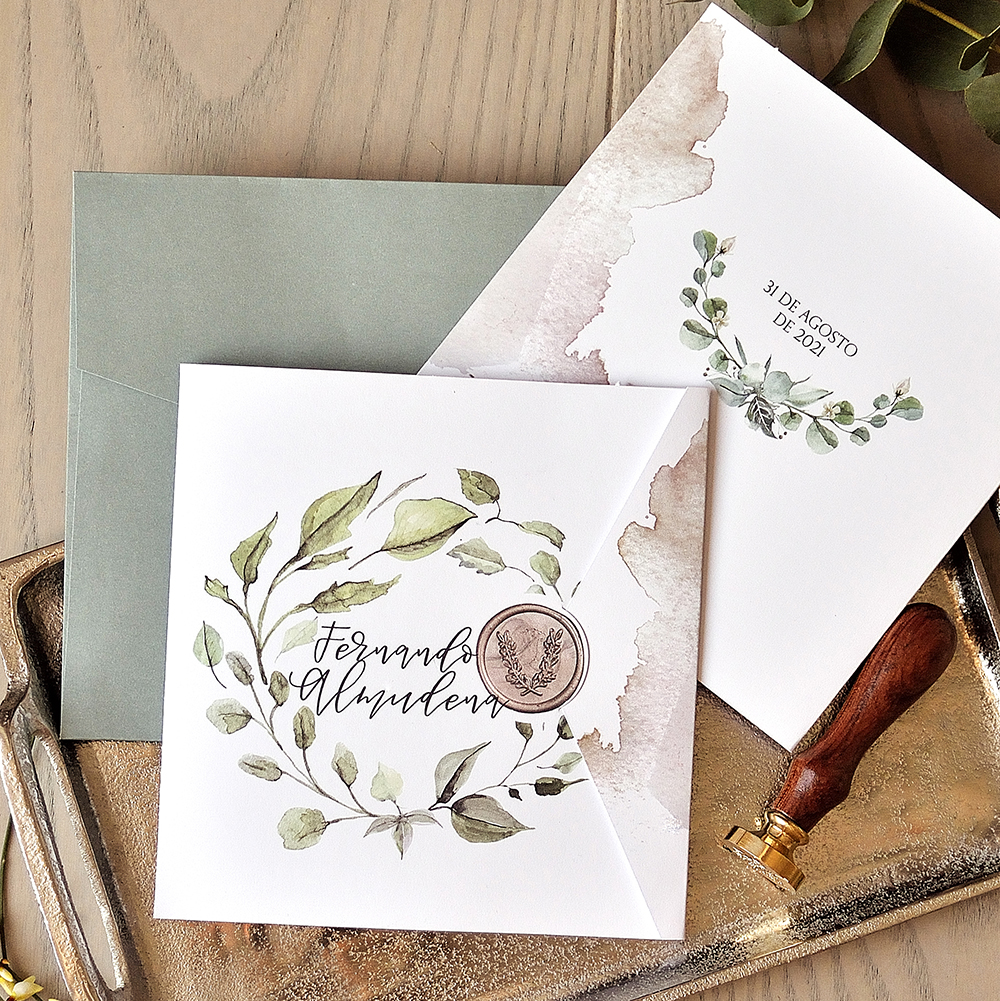 Invitación de boda online en tonos verdes como la naturaleza, para novios que buscan la sencillez y elegancia en forma de invitación de boda. Se imprimirán vuestros nombres en la portada de la invitación en la cual también hay una simulación de sello que va impreso en la solapa de la misma. Al abrir la invitación, vuestro texto personalizado, irá impreso en el interior. Tiene tarjeta de confirmación a juego (no incluída en el precio de la invitación). Tamaño del sobre "B" (no incluído en el precio de la invitación y disponible en varios colores: Greenery, Dusty Blush, Kraft y Mint) Mirar la pestaña "Tarjetas & Menú y clicar la opción de sobres para ver la disponibilidad de tamaños y colores a elegir. El sello va impreso en la tarjeta.