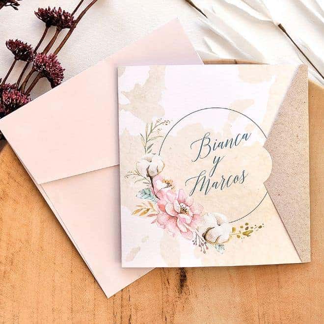 Invitación de boda vintage. Si buscáis una invitación con tonos suaves y cálidos que en la portada se puedan ver vuestros nombres dentro de un círculo decorados con flores, aquí la tenéis. Se cierra con una pestaña lateral. En la parte trasera va grabado 'Nos casamos' junto con todas las esquinas decoradas con flores. En el interior va impreso el texto de la boda. El sobre no va incluido en el precio. Se puede elegir otro color de sobre, disponible en: greenery, dusty blush, kraft y mint, tiene que ser formato B, lo podéis adquirir en la pestaña tarjetas&menú - sobres. Tiene tarjeta de confirmación a juego (no incluída en el precio).