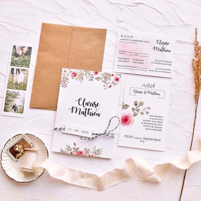 Invitacion de boda Boho Chic con flores y sobre de papel kraft.