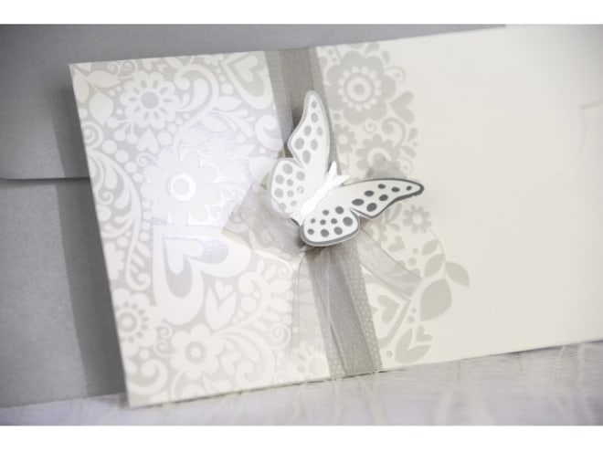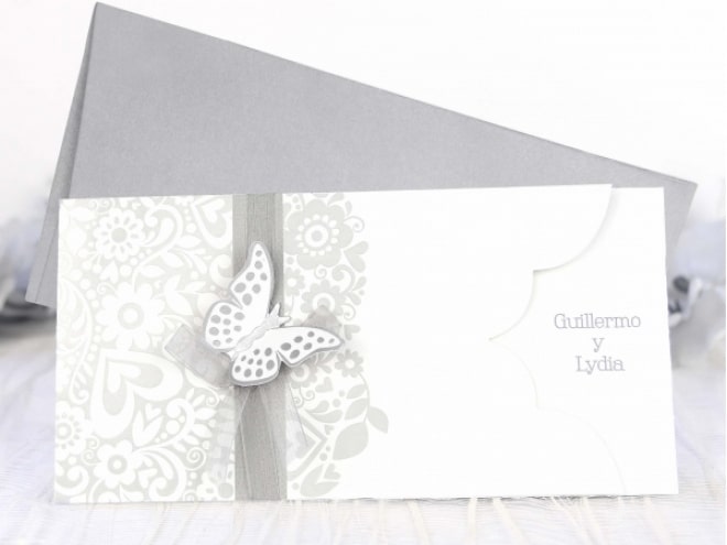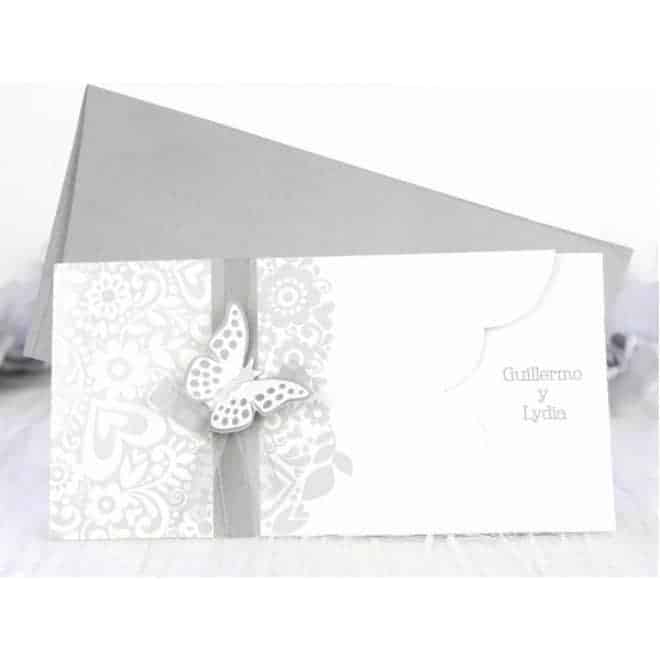 Compuesta por: tarjeta, lazo grisáceo (no se puede cambiar el color), mariposa y sobre gris.