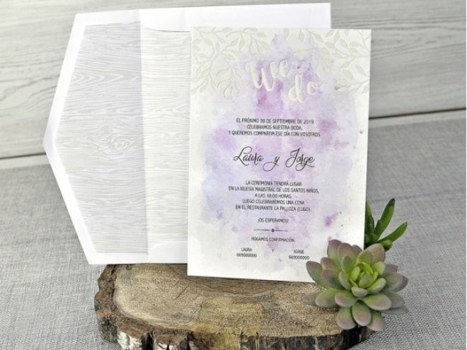 El precio incluye: invitación, lazo y sobre. NO incluye el forro de "madera", se cobra a parte, son 0'34 euros cada uno).