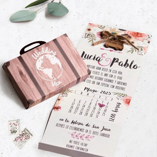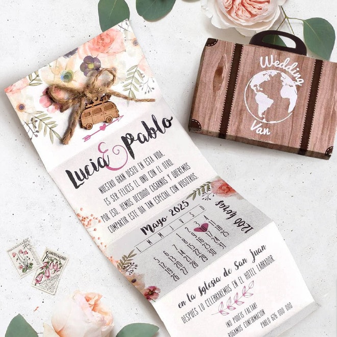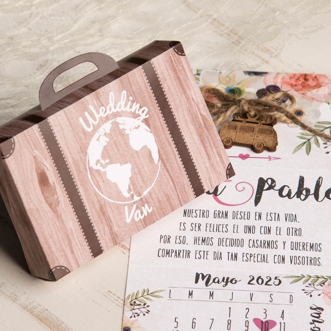Invitación de boda original para novios que buscan algo atrevido y divertido. La invitación se divide en cuatro pliegues en los cuales se imprimirá el texto del enlace. Una maletita de viaje le dará su toque final con el que sorprenderá a todos. Se puede imprimir en digital y en relieve.El accesorio de madera no está incluido en el precio. Se vende en paquetes de 10 unidades. Precio por unidad 0,26€. Medidas de la invitación abierta: 31 cm x 11,50 cm. Cerrada: 7,50 cm x 11,50 cm. Medidas de la maleta: 8 cm de ancho, 12 cm de largo y 2'5 cm de hondo.