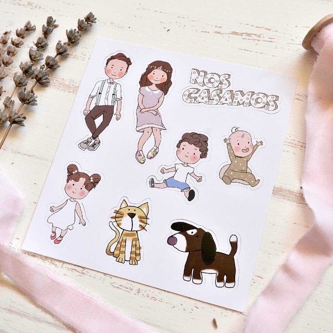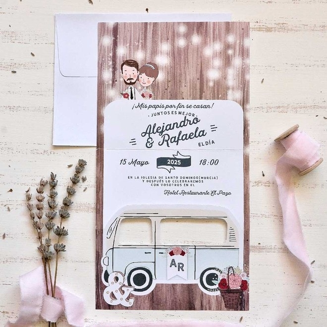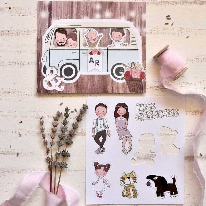 Invitación de boda original, simpática y viajera. ¿Qué tal la idea de viajar todos juntos? En esta invitación tenéis a la familia al completo con sus diferentes pegatinas para incluir a quien vosotros queráis. El texto de vuestra boda se imprimirá en el interior de la invitación. El sobre y las pegatinas van incluidos en el precio. Se puede imprimir en digital y relieve. Medidas cerrada: 13,50 cm de alto x 16 cm. Medidas abierta: 30 cm de alto x 16 cm de ancho.