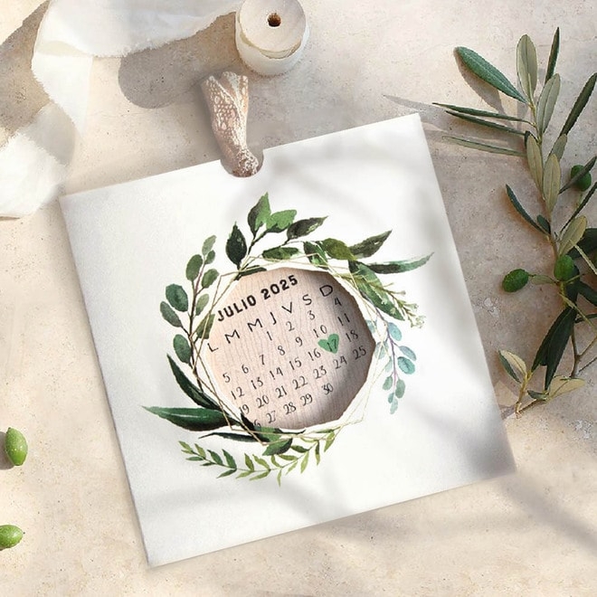 Invitación de boda original que nos indica la fecha más importante del año en el centro de la misma. Al estirar de una cuerda, nos mostrará el resto del texto con el que descubriremos el enlace de los novios. Se puede imprimir en digital o relieve. Medidas: 15 cm x 15 cm.