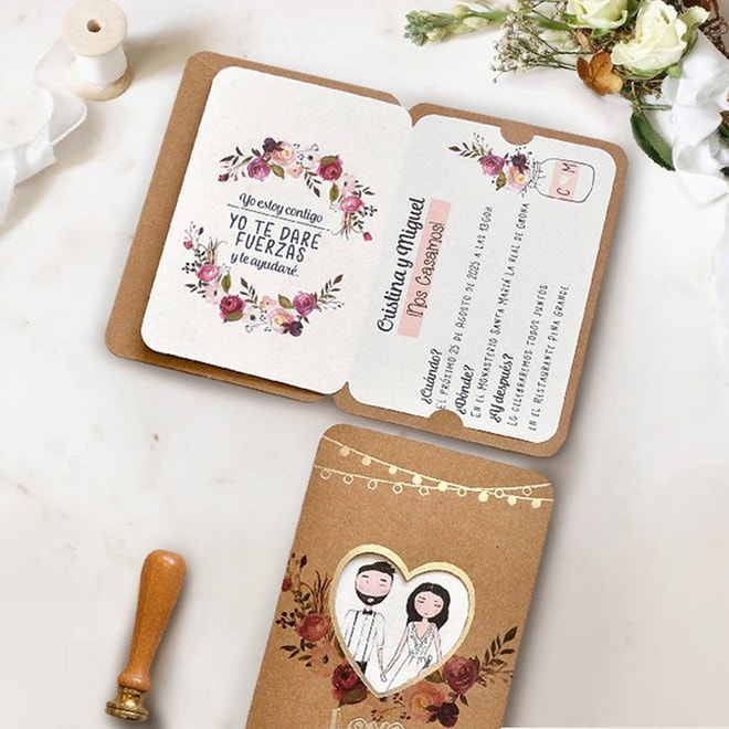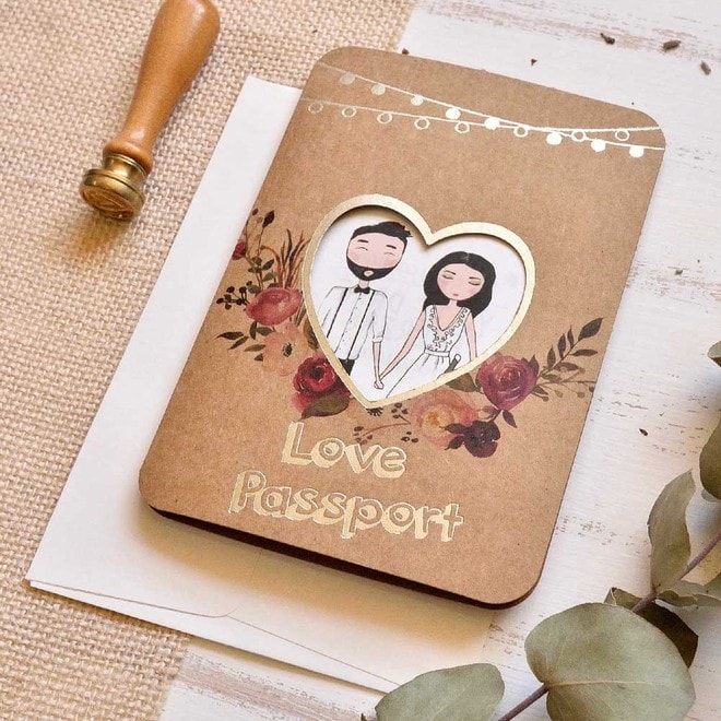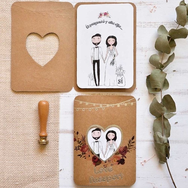 Invitación de boda tipo pasaporte. Compuesta: sobre, tarjeta exterior kraft LOVE PASSPORT y tarjeta interior con los dibujos de los novios y donde va impreso el texto de la boda. Medidas: 11,4x 16,4cm.