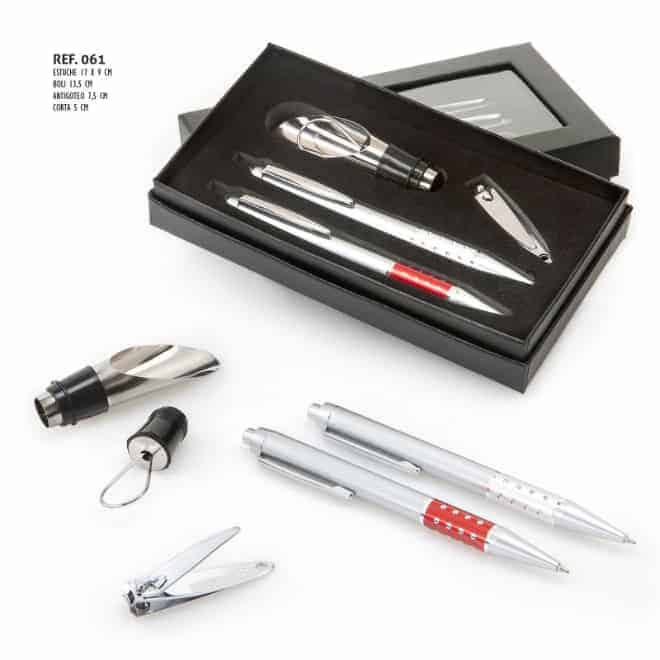 El set lleva dos 2 bolígrafos, un cortauñas y un antigoteo, un set muy completo que va metido en una caja de cartón.